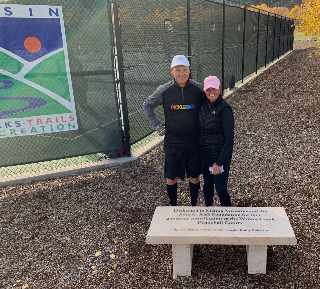The inscription reads: “Dedicated to Melina Nicolatus and the John C. Kish Foundation for their generous contribution to the Willow Creek Pickleball Courts. Special thanks to USAP Ambassador Kathy Pederson.”
